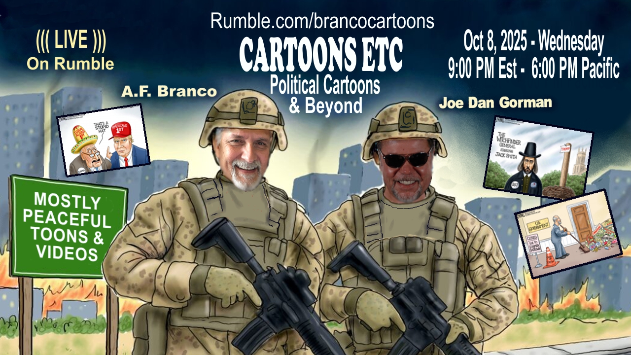 A.F. Branco and Joe Dan Gorman review Tony’s latest toons and discuss issues of the day along with videos, your comments, and some bad jokes. LIVE!