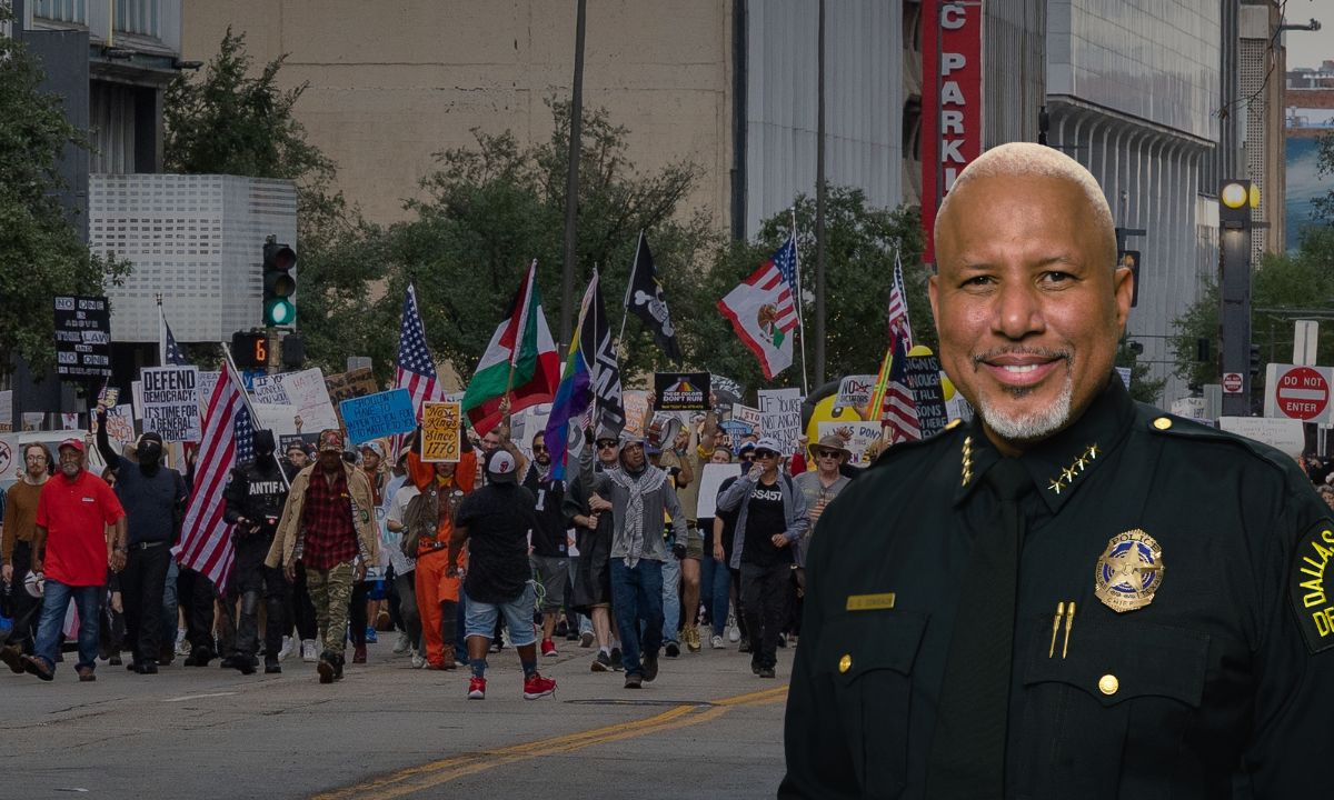 Daniel C. Comeaux Chief of Police | Image by Dallas Police Department/web; Dallas protest background image by Chris Jeans/Shutterstock