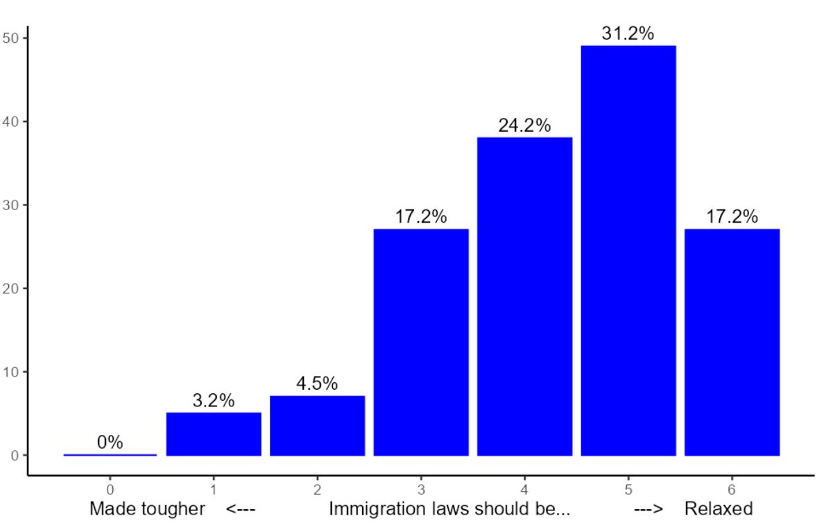 Figure 1: Immigration attitudes of immigration researchers. Taken from this paper.Figure 1 visualizes the personal immigration attitudes of the researchers. More than 72% think that immigration laws should be relaxed. Another 17% think immigration laws should neither be relaxed nor made tougher, and less than 8% think they should be made tougher.