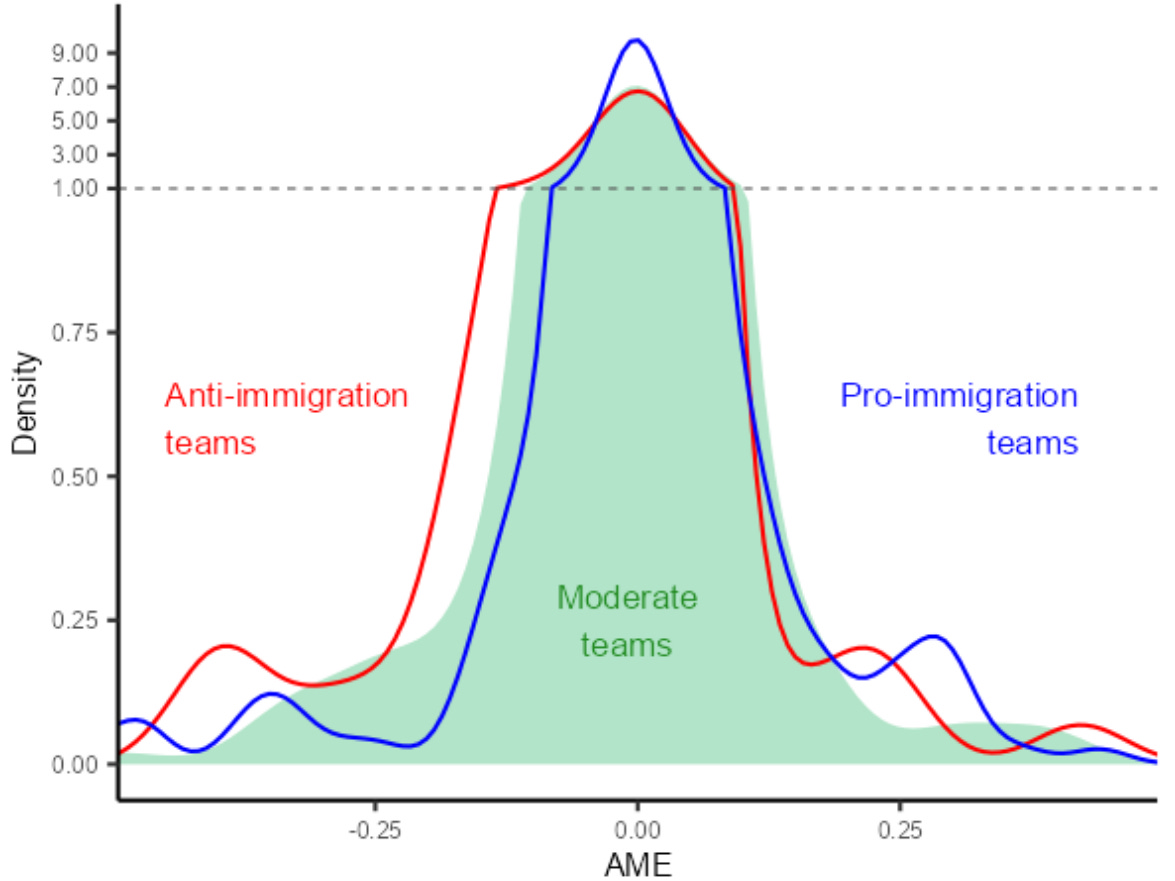 Figure 3 visualizes the distribution of the estimated effect by team type. The average effect estimated by anti-immigration teams was negative (i.e., immigration erodes pro-welfare attitudes), close to zero for moderate teams, and positive for pro-immigration teams. These differences were to a notable extent driven by a higher likelihood of anti- and pro-teams to obtain extremely large estimates. This association between researcher ideology and their findings is significant and remains robust after controlling for academic discipline, statistical skills, research experience, and many other factors.
