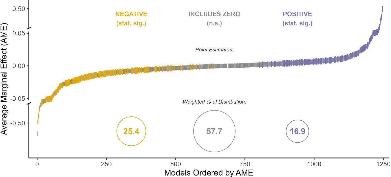 How large are these differences? Borjas and Breznau’s most rigorous analysis implies that moving from one ideological extreme to the other shifts a team’s estimate from roughly the 16th percentile of the (control-adjusted) effect distribution to the 63rd percentile. Looking at Figure 2 (which shows a slightly different distribution), that means going from the region where effects are largely negative and statistically significant to the region where they are mainly positive and significant.