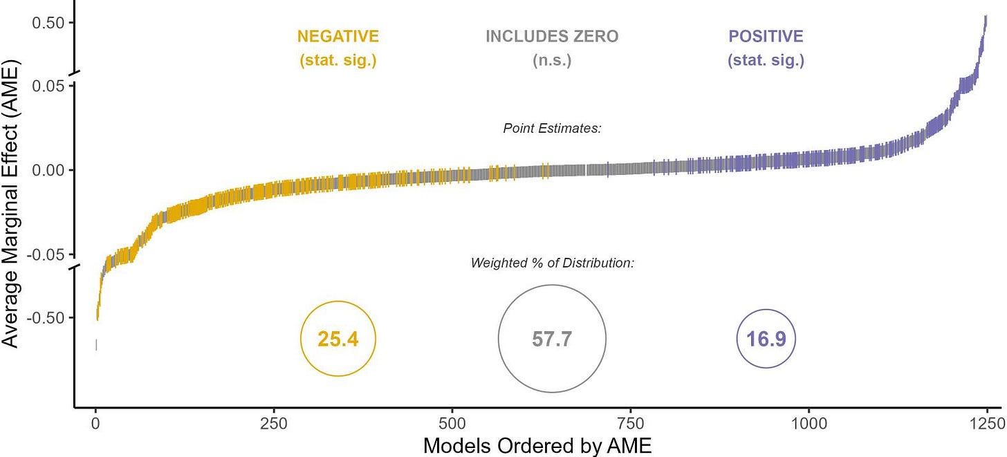 The more worrying result comes from a follow-up study (Borjas and Breznau 2024). They examine whether the researchers’ prior immigration attitudes explain their findings. To that end, Borjas and Breznau define a pro-immigration team as one where more than half the members chose one of the two most extreme pro-immigration options (5 or 6, see Figure 1). This classifies 44% of all teams as pro-immigration. Given the rarity of anti-immigration attitudes among participants, Borjas and Breznau classify teams with at least one member responding with an attitude of “1” or a “2” as anti-immigration (because no one chose the most extreme anti-immigration option; 0). This definition classifies roughly 13% as anti-immigration. The remaining 44% were classified as “moderate.” These different findings resulted, of course, from different analysis choices. Notably, there are not a few choices that account for most of the variation. The authors note that “more than 95% of the total variance in numerical results remains unexplained even after qualitative coding of all identifiable decisions in each team’s workflow.” Hence, each choice, like adding a control variable, makes a small difference, and due to their sheer number, effects add up, leading to very different results.