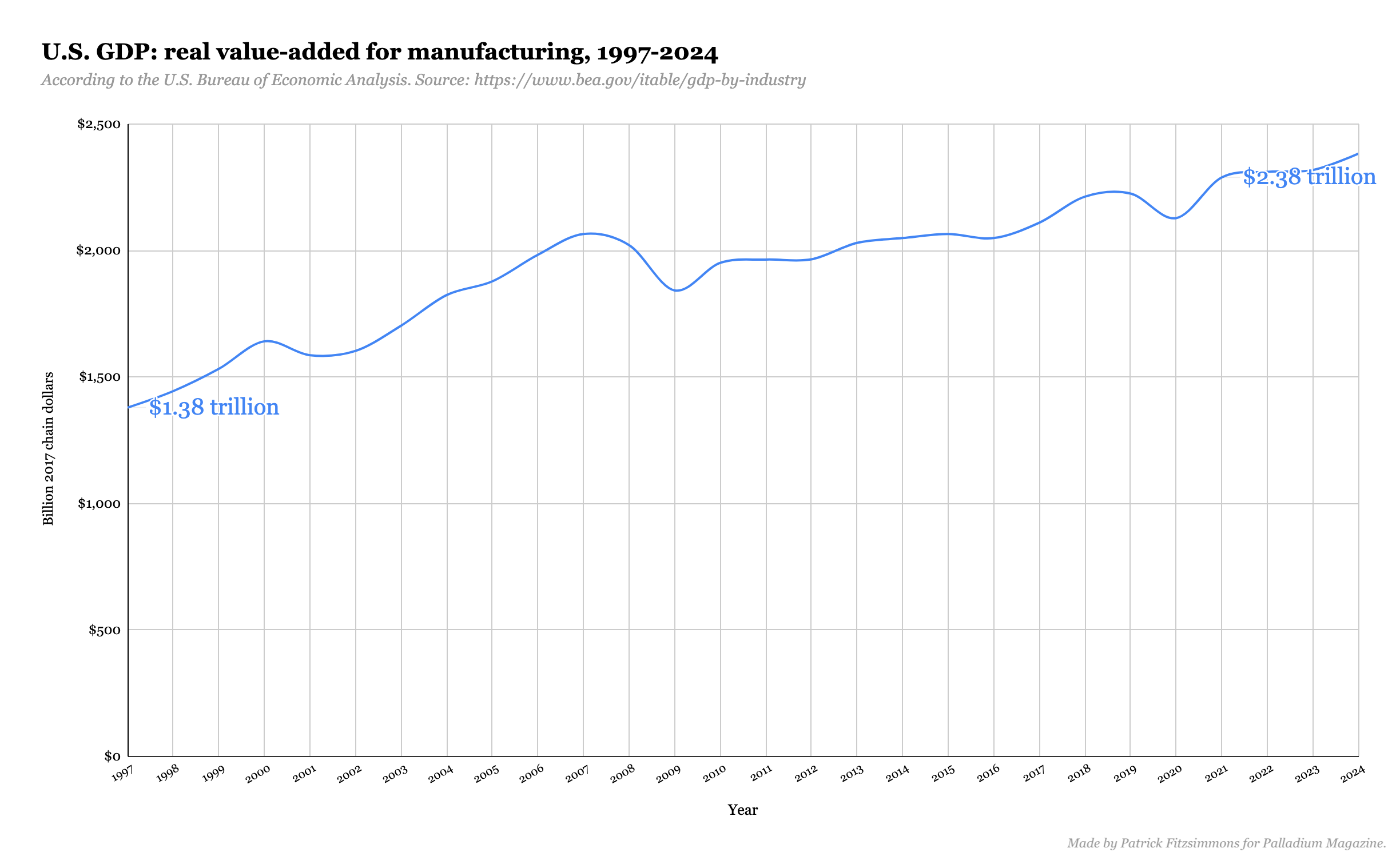 The most commonly cited graph shared to demonstrate U.S. manufacturing strength is based on the U.S. Bureau of Economic Analysis’s (BEA) manufacturing “real value-added” data, which looks at manufacturing as a subset of total GDP. This graph has been cited by Federal Reserve economists, Washington Post columnists, professors—all claiming it refutes the idea that the U.S. economy has been hollowed out. Adjusted for inflation, it shows manufacturing is up 71% since the dataset began in 1997, and up a healthy 37% per capita: