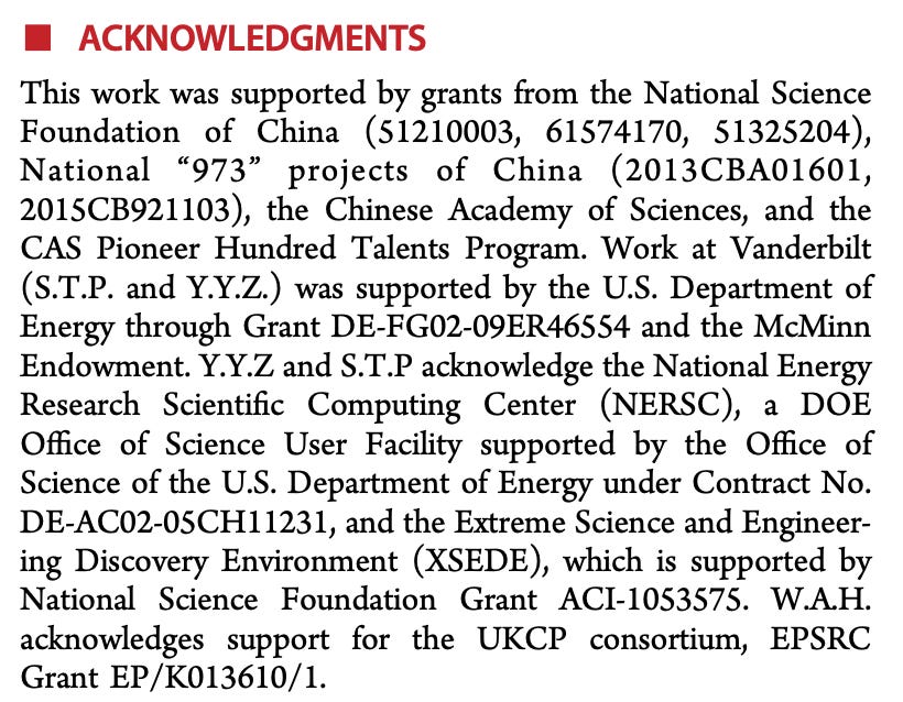 The paper “Evidence for Ultralow-Energy Vibrations in Large Organic Molecules” counted support from the Energy Department and National Science Foundation. As shown below, these funds went to a project under the auspices of China’s Hundred Talents Program, a Chinese government recruitment initiative launched in 2008 to lure scientists, engineers, and academics from abroad to work on projects tied to Beijing’s strategic priorities.