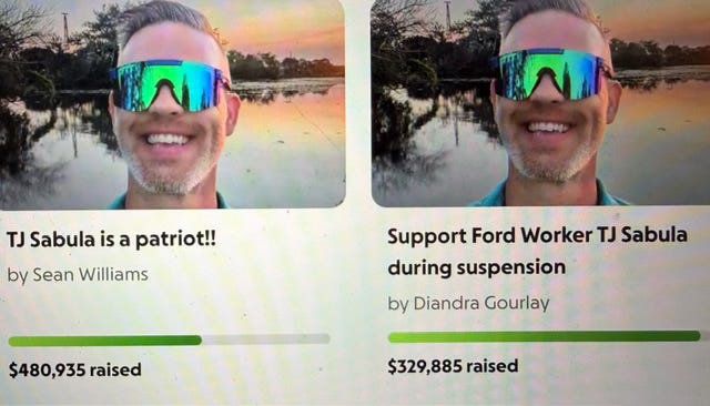 The “Support Ford Worker TJ Sabula during suspension” page raised $329,885 from 13,400 contributors.