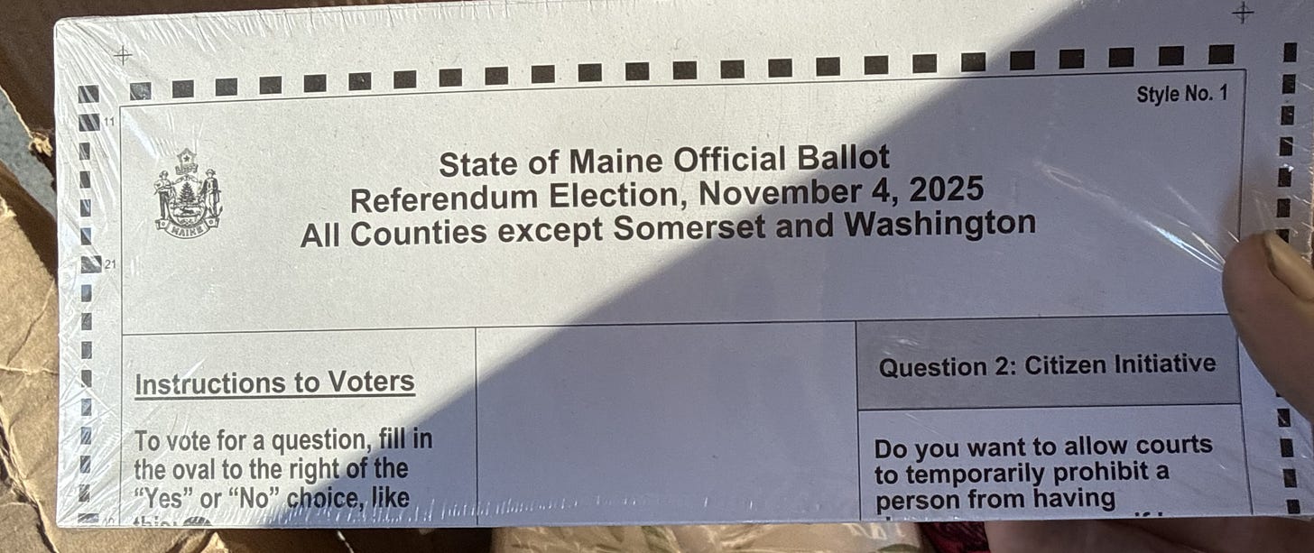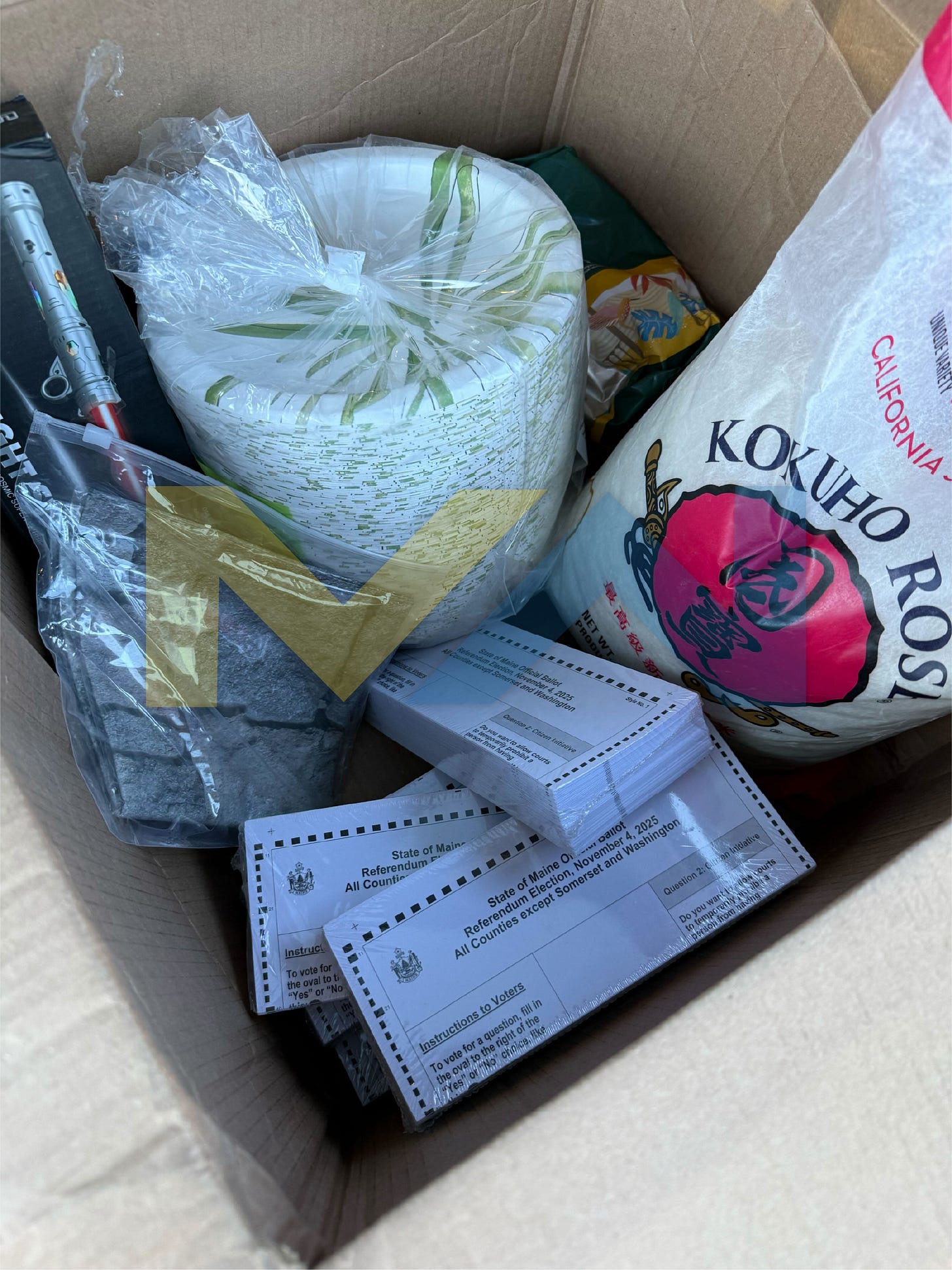 A resident of Newburgh, Maine, received an unusual order from Amazon on Tuesday: a bag of rice, some paper plates, a lightsaber toy for her child, and 250 authentic State of Maine election ballots printed in advance of the Nov. 4, 2025, statewide election.
