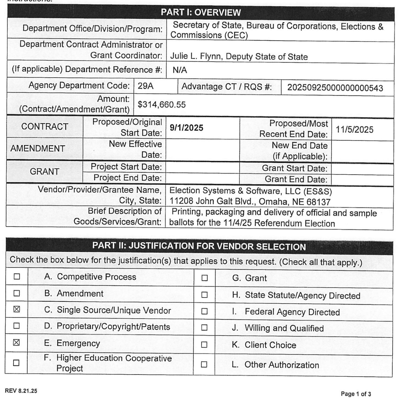 In the case of Maine’s 2025 election ballots, however, Secretary Bellows instead issued a Notice of Intent to Waive Competitive Bidding, or NOI, which allowed the office to avoid competitive bidding and instead issue the ballot printing contract to Election Systems & Software, LLC (ES&S) of Omaha, Nebraska. According to state documents, the company is responsible for “printing, packaging and delivery of official and sample ballots for the 11/4/25 Referendum Election.”
