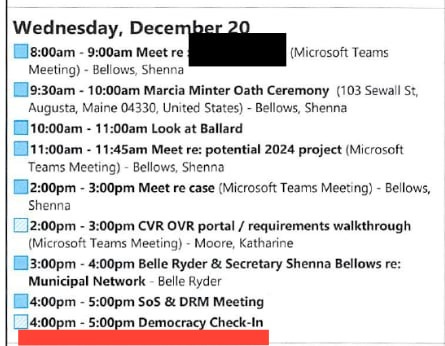 Those group meetings — described on Bellows’ calendar as “Democracy Check-In” — included the controversial League of Women Voters of Maine, a group that has explicitly discussed advocating non-citizen voting at events attended by Bellows, as well as other professional leftists dedicated to securing election advantages for the Democratic Party.