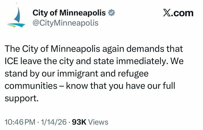 Instead of demanding that criminal illegal aliens leave, Democrats who run the metro area have posted on the city’s official X account, demanding that ICE agents leave the town.