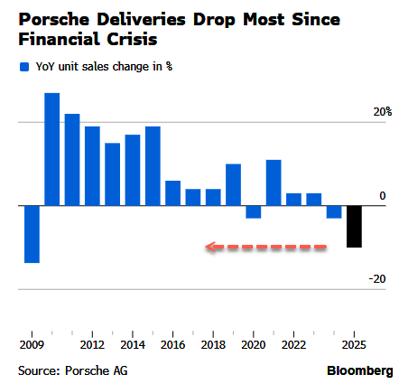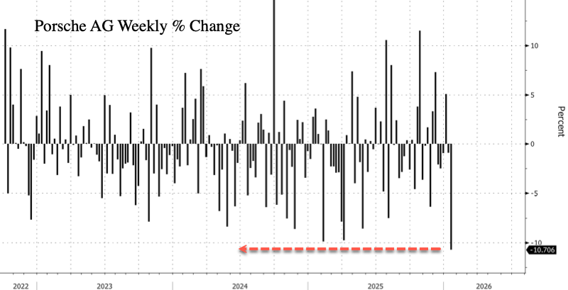 (Zero Hedge)—Porsche AG shares in Germany are headed for their steepest weekly decline since trading began in late 2022, after the 911 maker reported that vehicle sales in the 2025 selling year fell to their lowest level in 16 years.