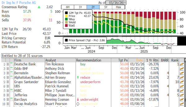 According to Bloomberg data, analysts remain mostly pessimistic on Porsche, with just five buy ratings, 13 neutral ratings, and 11 sell ratings.