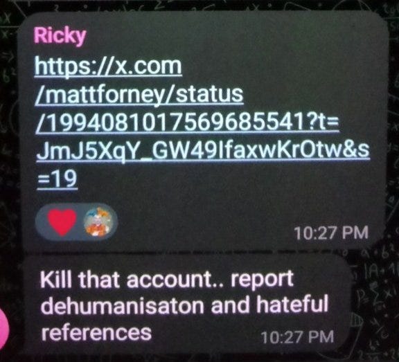The sheer amount of money at stake for India, Mexico, and other third world countries from remittances alone means they will do anything to keep the Trump administration from turning the spigot off. I’ve posited in the past that the Indian government has positioned spies in the crucial American industries they now dominate, spies who could be ordered to wreak havoc on American national security and the economy should India’s interests be threatened. We have already seen how Indians at X/Twitter have manipulated the platform to silence their critics, allowing mass report groups to ban “enemy” accounts or spam them with bogus Community Notes (which impacts income, since X posts that have Community Notes are demonetized). This is a screencap of an Indian mass reporting Telegram group where they are targeting my X/Twitter account: