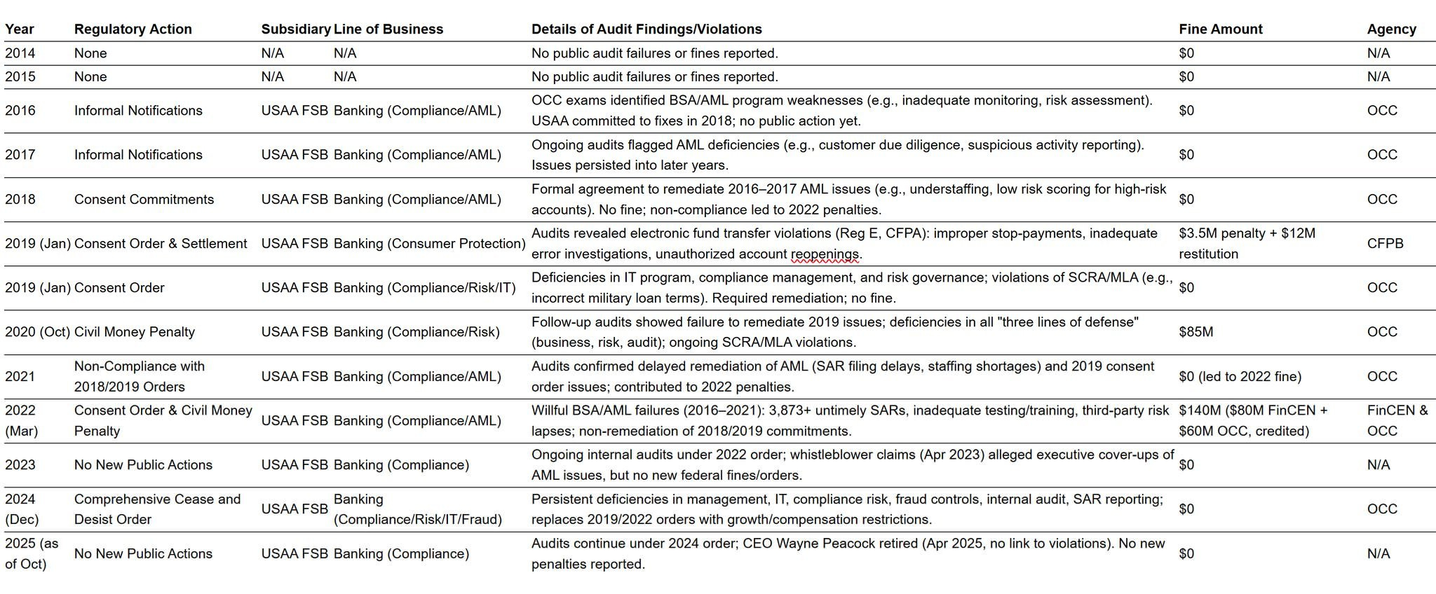I was recently contacted by an insider with over a decade of experience working for major banks as a risk officer. They also hold an advanced degree in computer science and through their education and experience, they are intimately familiar with the basic automated controls that any financial service must implement in order to comply with U.S. KYC (know your customer) and AML (anti-money laundering) laws. All financial institutions must adhere to these under laws such as the Bank Secrecy Act, and failure to do so can result in crippling fines and even criminal prosecutions. For example, USAA’s failure to properly record its customers’ transactions resulted in the company failing multiple federal audits, forcing it to sell off its real estate, asset management, and investment management divisions. Below is a list of audits that USAA failed: