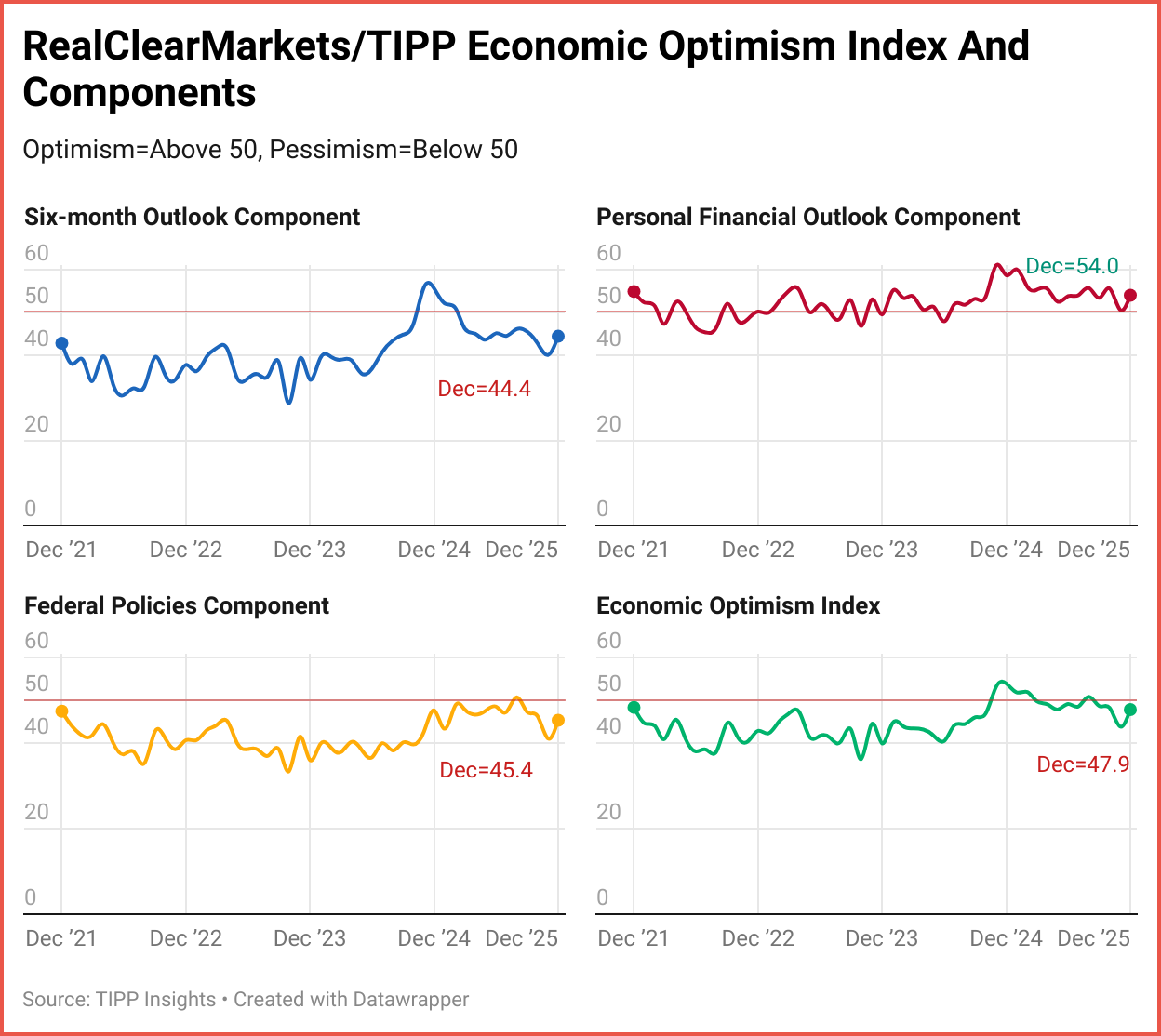 Consumer confidence is beginning to lift. The RCM/TIPP Economic Optimism Index posted its strongest monthly gain in months in December, with all three components improving. While it is still early and sentiment remains below neutral, rising confidence reduces the urge for protest voting and sets the mood that often carries into election years.