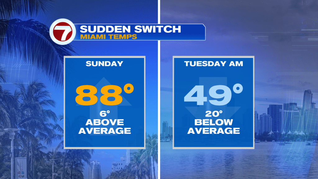 Tuesday morning will be unpleasantly cold. Temps will plunge into the upper-40s and lower 50, challenging the record low of 48 set in 1913 in Miami.