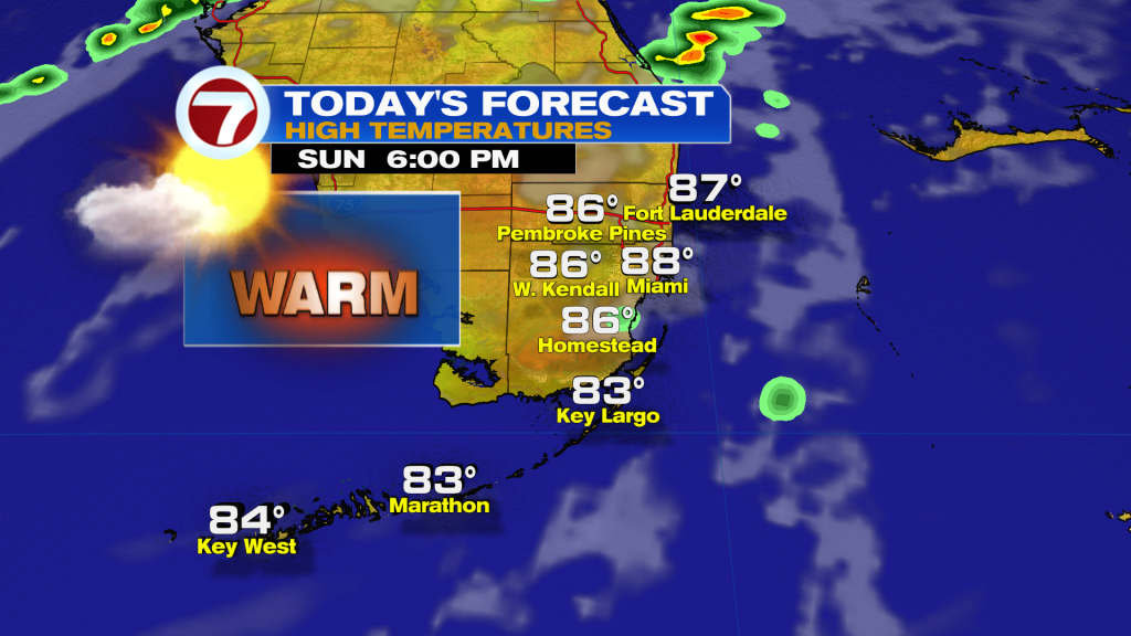 The rest of your Sunday will feature toasty temps with highs back in the upper-80s. Expect a mix of sun and clouds with a few storms. Light winds will make for a great beach day.