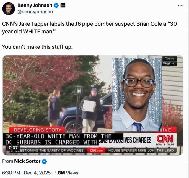 Almost immediately, Jake Tapper of CNN, despite having photos, reported the bomber was a 30-year-old white man. That assertion didn’t last long—Tapper was forced to issue a rare correction and apology--but Democrats, congressional, media and otherwise, were determined to prop up the primary narrative. That lasted only a little longer.