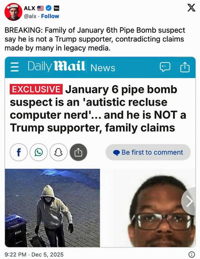 The arrest of the alleged January 6 pipe bomber has posed some serious problems for the Democrat’s preferred narrative that the bomber must have been an evil, MAGA, insurrectionist, domestic terrorist, Trump-loving, white supremacist guy determined to overturn the election by setting off bombs that would distract noble Capital Police personnel at just the right moment, thus allowing the equally evil and obviously coordinated rioters to overrun the Capital Building and murder every helpless and noble Democrat member of Congress.