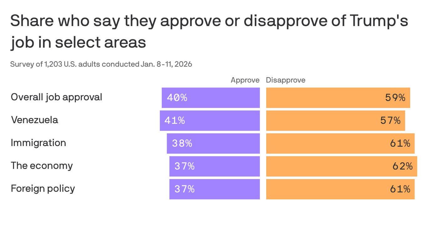 What they're saying: "Nearly 80 million Americans gave President Trump a resounding Election Day mandate to end Joe Biden's economic disaster, secure our border, mass deport criminal illegal aliens, and put America First on the world stage," White House spokesperson Kush Desai told Axios. Here's where the president is losing public support. The Trump administration's immigration agenda has taken a sharper turn in 2026, as reports of ICE agents using increasingly aggressive tactics have become more frequent. Driving the news: Only 38% of Americans approve of Trump's immigration enforcement, down 49% from March, according to the AP-NORC poll, shortly after 37-year-old Minneapolis mother Renee Nicole Good was shot and killed by an ICE agent. Yes, but: Some voters continue to give the president leeway on immigration, with 45%, saying Trump has helped immigration or border security "a lot" or "a little" in his second term, according to the AP-NORC poll. During his second term, the president has taken aggressive steps abroad — including supporting a U.S. military operation in Venezuela without congressional approval. By the numbers: The recent AP-NORC poll found that 56% of Americans believe Trump has "gone too far" in using military forces overseas, while 45% say the U.S. should take a less active role in addressing global conflicts. Zoom in: The president also revived his push to take over Greenland, the resources-rich, autonomous territory, that's part of the Danish kingdom. Trump has claimed responsibility for the economy, while arguing that rising prices are the result of inheriting a weak economic situation from former President Biden. The other side: Only 37% of Americans approve of Trump's handling of the economy overall, while 62% disapprove, the AP-NORC poll shows. Go deeper: Trump lashes out against "fake polls" as his approval ratings sink Methodology: The AP-NROC poll of 1,203 U.S. adults was conducted online between Jan. 8-11 and has a margin of error of +/- 3.9 percentage points. The Quinnipiac poll of 1,133 self-identified registered voters was conducted via telephone between Jan. 8-12 and has a margin of error of +/- 3.7 percentage points. Immigration