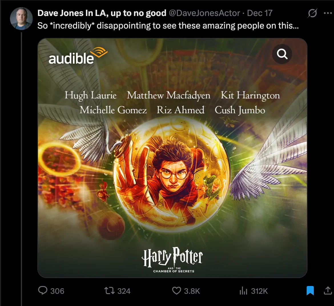 It didn’t stop with games, however, as a new audio production of Harry Potter with a full cast was being produced. This audiobook has great ratings on Amazon and really pulled out the stops for production, and it made the woke lunatics very mad.
