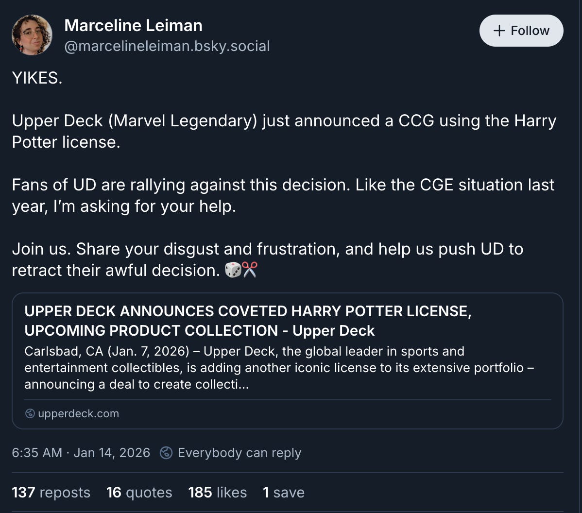 Any time any news of Harry Potter or related products, a cancel mob pops up to try to concern troll the people making the product or production to try to drop out. Now, Upper Deck has announced they have a license for Harry Potter cards, and the BlueSky board game mob has activated to try to put a stop to it.