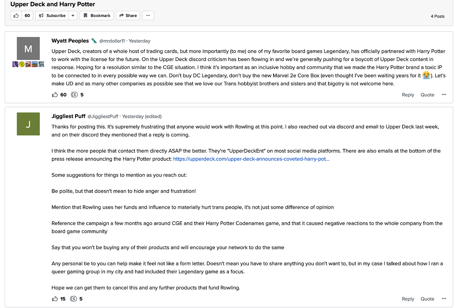 Naturally, a thread got going regarding Upper Deck’s Legendary Card Game, which popped up trying to encourage the cancel mob further:
