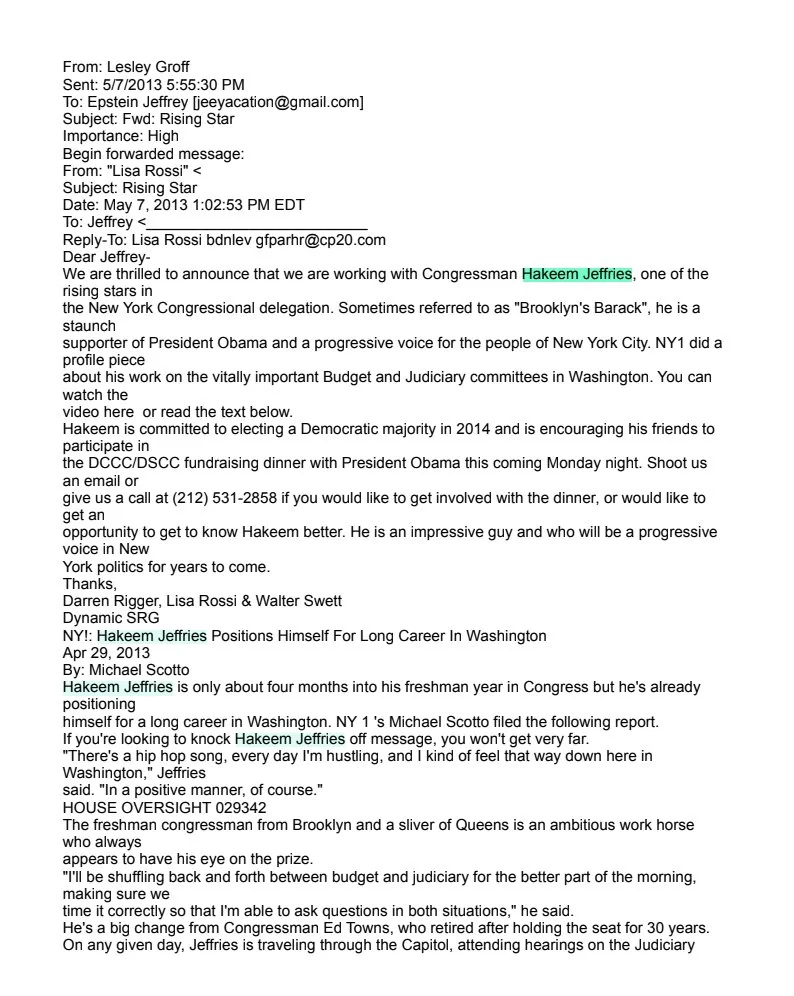 Democrats kept trying to tie Trump to Jeffrey Epstein. Instead the Epstein files continue to show extensive connections to the Democrats. Including a fundraising email inviting Jeffrey to meet Hakeem Jeffries, the current Democrat minority leader, billed as “Brooklyn’s Barack” for a fundraising dinner with Obama. “Shoot us an email,” the invitation says, if you would like “an opportunity to get to know Hakeem better.”