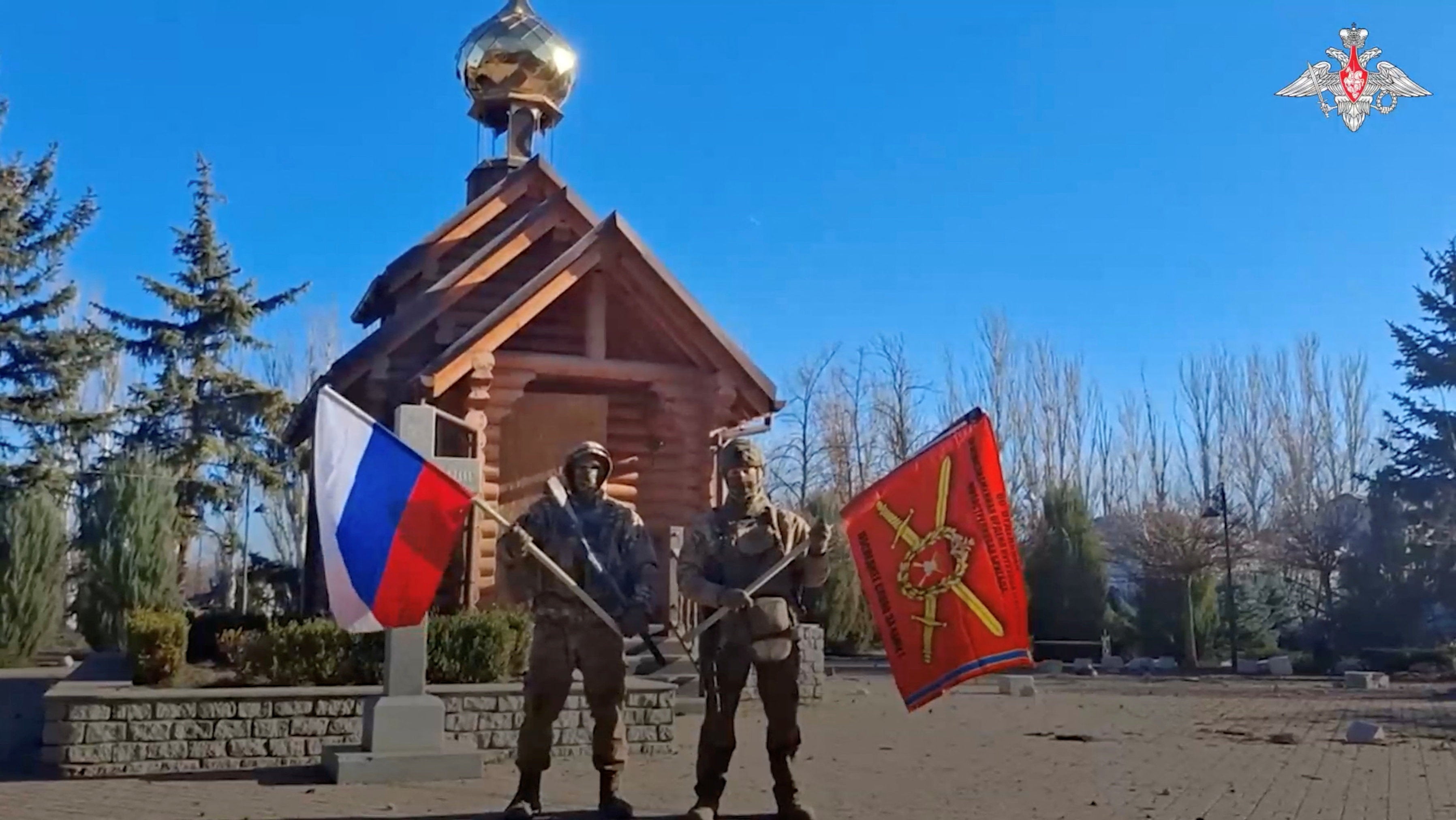 In pictures: Russian service members hold flags in front of a chapel in the town of Huliaipole in Zaporizhzhia