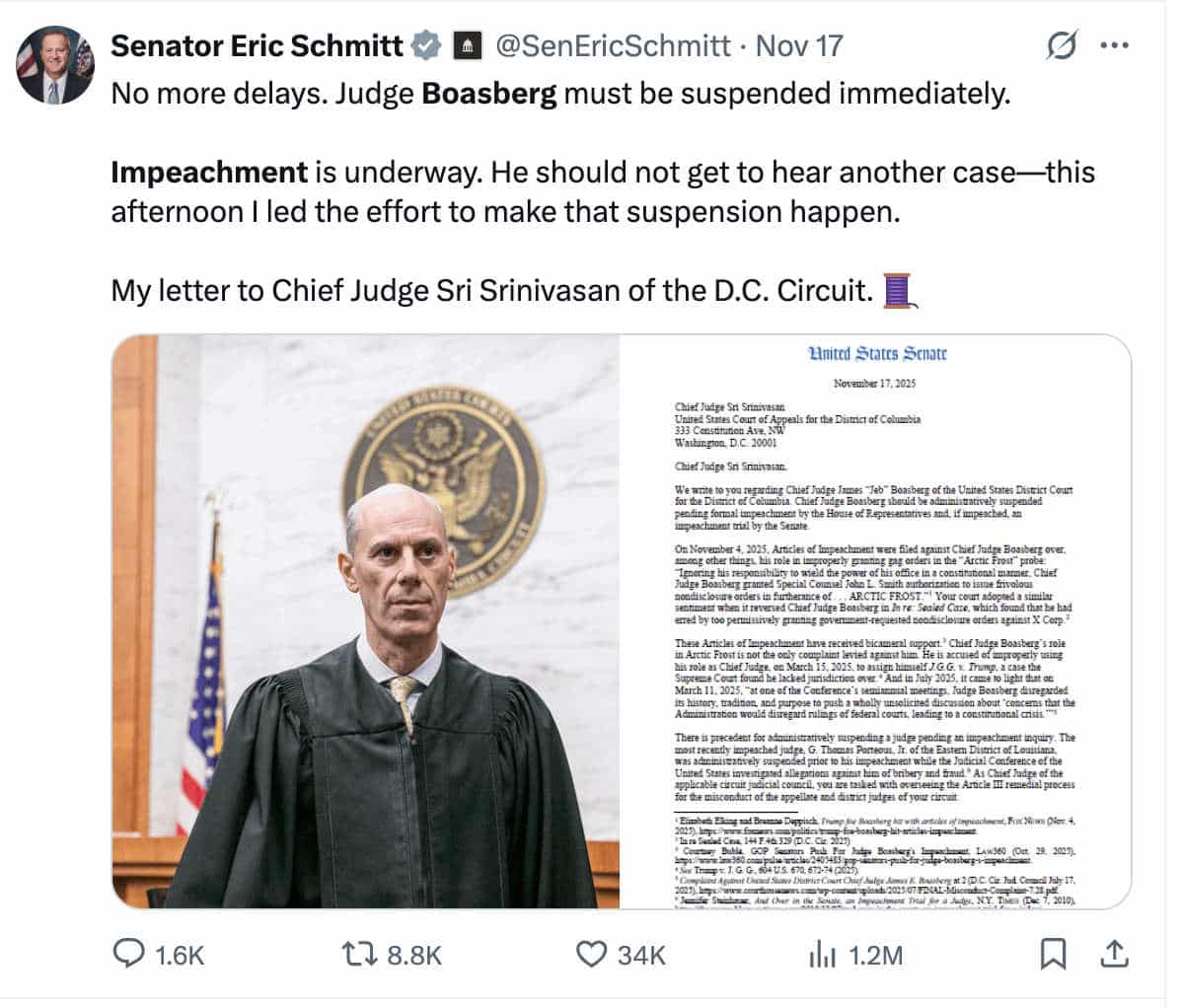 Will Judge Boasberg finally be impeached? Six Republican Senators asked Sri Srinivasan, the chief judge of the DC Circuit Court, to suspend Boasberg pending potential impeachment proceedings in the House against the Obama appointee who devotes his time to lawfare against President Trump.