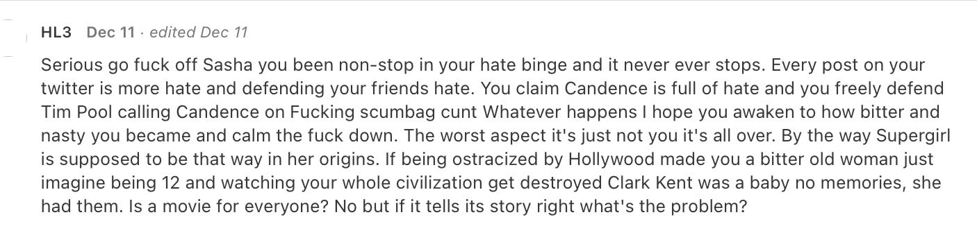 I can’t lie and pretend to be excited for Supergirl. It’s not a movie made for me, and I’m not sure I can handle one more girl boss movie, especially one whose tagline is “Truth, justice, and whatever.” Maybe my daughter will like it. But let’s move on to the red meat of this, shall we? What is this “non-stop hate binge” I’ve been on lately?