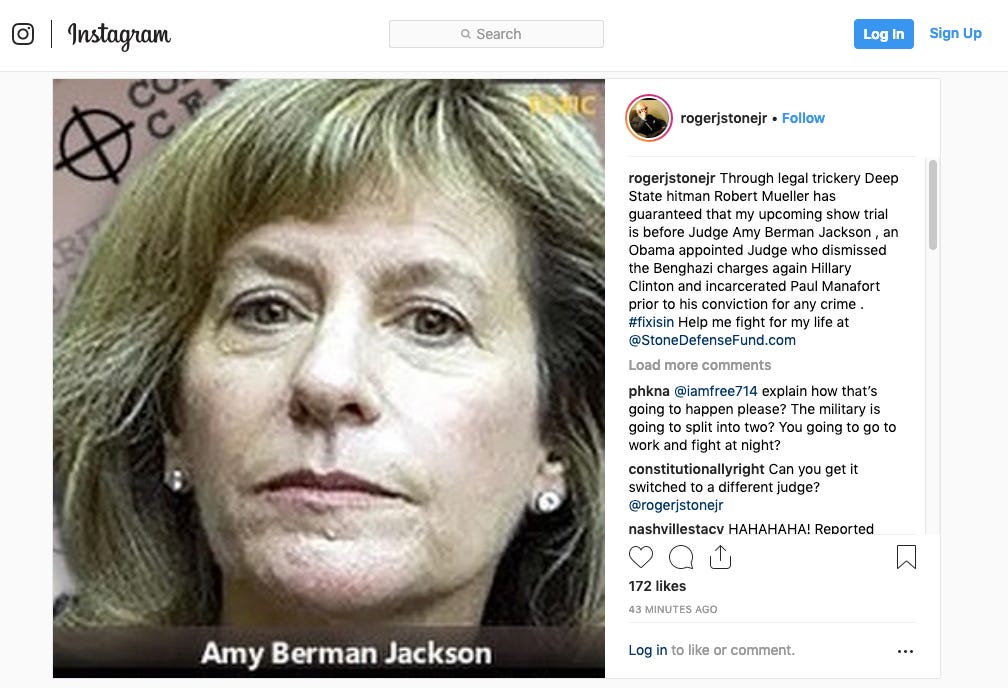 My Instagram post did, however, expose Mueller’s legal trickery to ensure that I was tried before Judge Amy Berman Jackson, who had already viciously violated the constitutional rights of Paul Manafort by incarcerating him in solitary confinement long before he had ever been convicted of any crime.