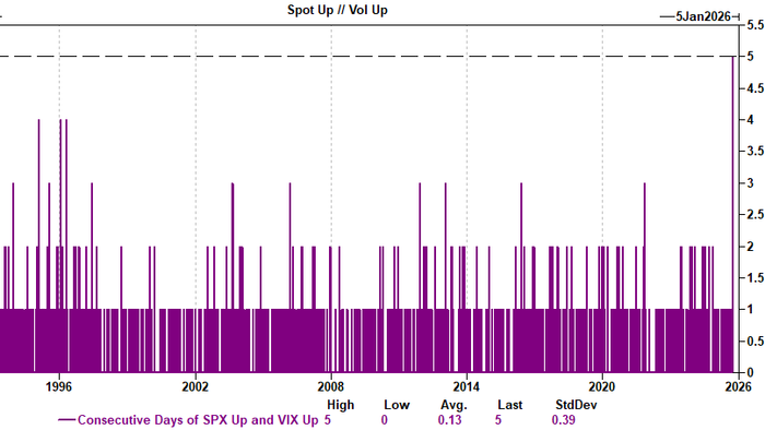 A few days ago, we pointed out the recurring of one of the more bizarre of market phenomena: VIX rising not on put buying (i.e., the traditional reason for the VIX to rise as traders hedge aggressively against a drop) but on call buying: indicative of peak momentum-chasing frenzy, one where literally everyone is buying calls to capture market upside with leverage.