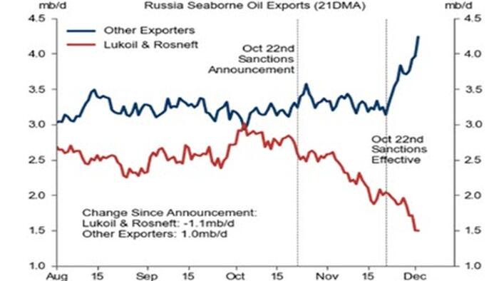 According to data recently quoted by Goldman Sachs, since the sanctions came into effect, oil flows from Rosneft and Lukoil abroad had dropped by around 1 million barrels daily. However, in the same period, flows from non-sanctioned Russian oil companies to clients overseas have gained half a million barrels daily.