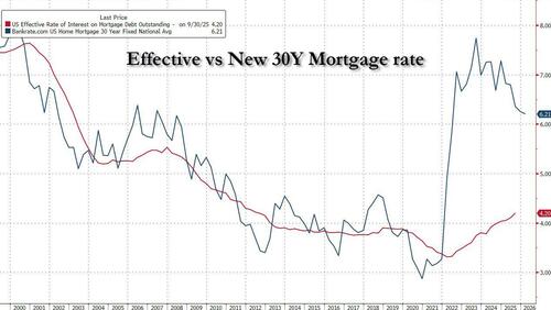 More importantly, the gap between the effective outstanding mortgage, which was most recently at 4.20% and reflects all the refis and new mortgage done when rates were much, much lower, and the new Bankrate 30Y mortgage, has shrunk to the lowest level since 2021.