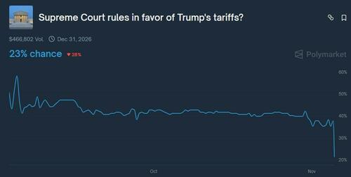 Odds of the Supreme Court siding with Trump over tariffs tumbled on Wednesday, after conservative justices Kavanaugh, Gorsuch, and Coney Barrett asked tough questions during oral arguments in two cases.